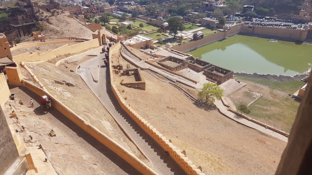 There are many way to reach Amer fort,walking to fort take around 15 minute from the road,its not so stiff hike through easy stairs,except for 2 point its different than the elephant path,only 2 point it crosses the Elephant path,1 time just crosses the elephant path and another just before fort entrance 20-30 minute common route.If having own vehicle the can reach up to car parking on top with vehicle and then relatively easy walk.The bus dropped us just in front of starting point ,1st a small garden then stairs to fort started,it was a gentle 15 min hike to Fort.